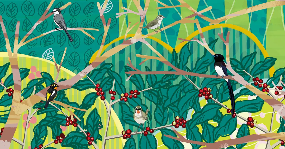 夏鳥の越冬地を守る森で育てたアグロフォレストリーコーヒー。提携店で販売し農家に利益を還元しながら、研究と保全をつなぐプロジェクト。