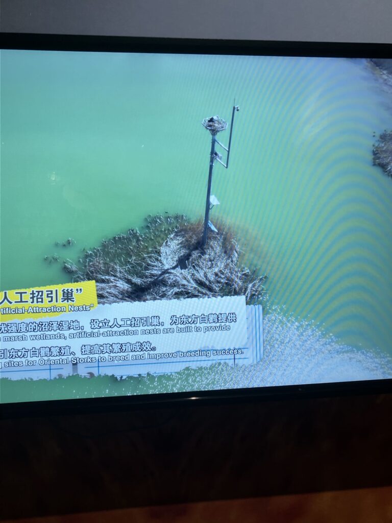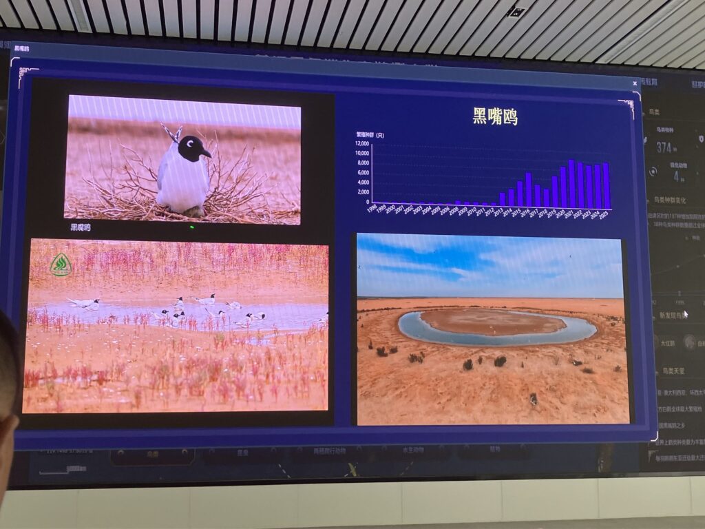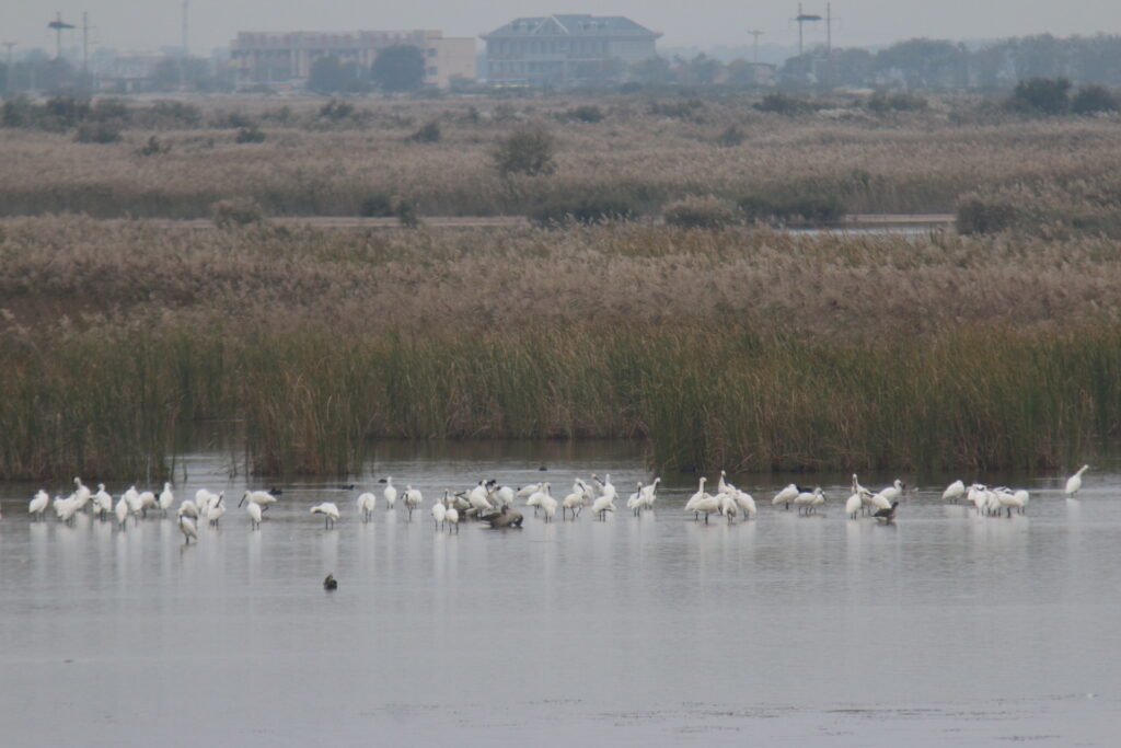 2時間ぐらいで、黄河口生態旅遊区(保護区だけど観光施設のようなものもありました)に入り、その中のコウノトリ教育センター(東方白鸛宣教中心)にまず立ち寄りました。展示や説明が充実の立派な施設で、案内の女性が、コウノトリ、ズグロカモメ、復元湿地について解説して回ってくれました。当地のおおよその概要を学習し終えた我々は、またマイクロバスに乗り解説を聞きながら観察して回りました。普段立ち入れない保護区の中に入れるとのことで期待していたのですが、マイクロバスのおじさんが結構なスピードで土の道路を爆走するので、双眼鏡が手につかず、ほぼ種名がわかりませんでした!ニシハイイロペリカン(Dalmatian Pelican)は、皆がストップ!と叫んだものの間に合わず、飛び立った後ろ姿を眺める羽目になりました。保護区内にある観察台では、時間を取って観察ができました。時期はまだ早かったようですが、見渡す限りの広大な復元湿地に多くのガンカモなどの水鳥が遠くの方で休んでいました。入国時の手間を恐れて望遠鏡を置いてきたのが悔やまれました。