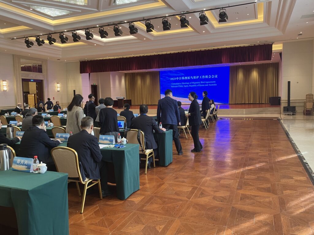 お互いの国の保護すべき渡り鳥のリストを渡しあって互いに保護したり、行き来する渡り鳥についての共同研究の提案などを行ったりします。日、中、韓、豪の4か国は、2年ごとに持ち回りで、この会合を行っています。今回は、中国が当番にあたり、10月21日から23日にかけて会場を山東省東営市に設定し行われました。環境省野生生物課長を筆頭に、自然環境研究センター、山階鳥研、ウェットランドインターナショナルジャパン、宮島沼水鳥・湿地センターから専門家が参加し、バードリサーチからは、シンバ・チャンさんと私(守屋)が同行し、おもに、ツル類、ガンカモ類、シギ・チドリ類、陸鳥について各国と意見交換しました。会議の結果等については、環境省から報道発表があると思います。