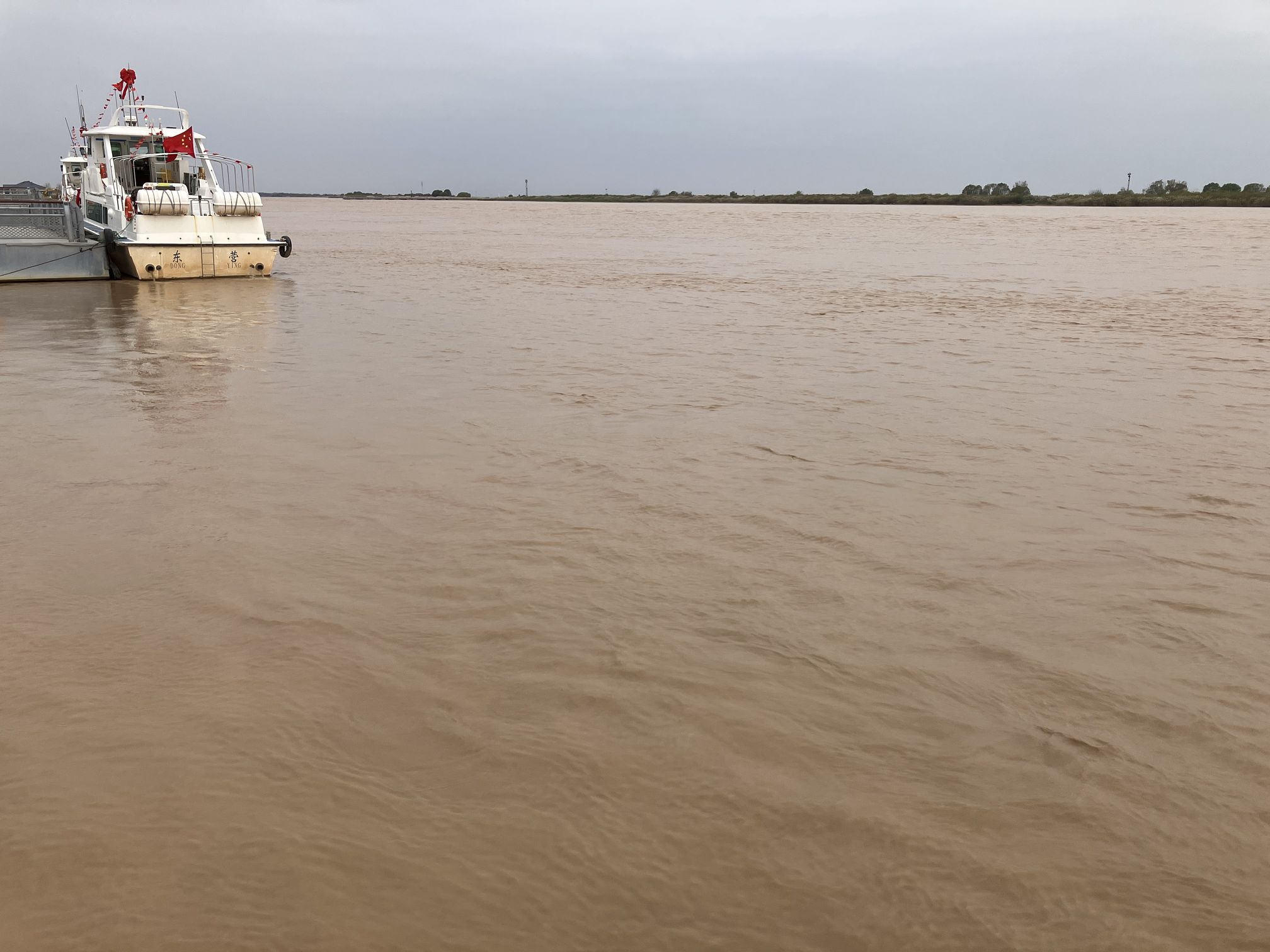 23日は朝方に雨が降っていましたが、出発前には止んでおり、マイクロバスに乗り込み黄河河口を目指します。ホテル付近以外は外出できていなかったので、移動中の街並みそのものも興味深く、平坦な道が延々と続く道路も大陸を感じさせました。山が見えません。