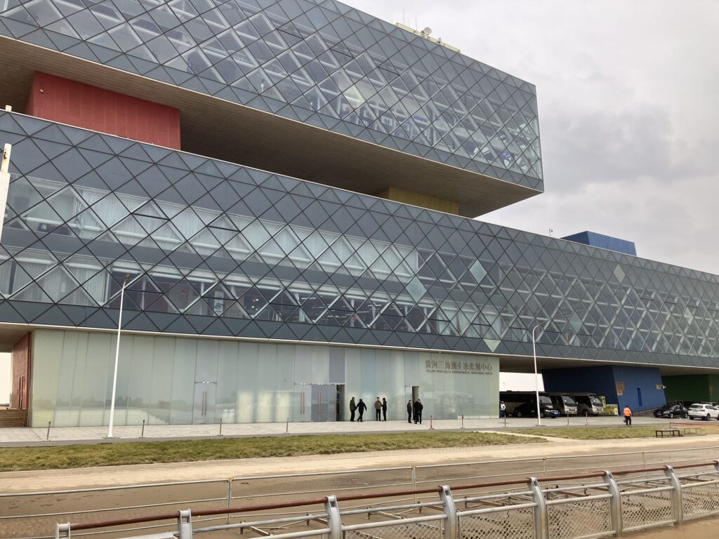 その後、渤海にそそぐ黄河河口付近を眺め、黄河モニタリングセンターの大きな建物で、黄河の流量や堆砂量などのデータなどの説明を受け、昼食をとりました。歴史的に黄河は何度も流路を変えているそうです。また、流域人口が多いため、慢性的な流量不足の状態にあるそうです。世界第6位の大河にしては、意外に狭く目の前の川幅は600mぐらいとのことでした。黄土の堆積で形成されたデルタは広大だが、道路や区画が整い、コーリャンや牧草の農地、石油発掘の建物が並ぶなど、想像以上に開発が進んでいる印象も受けました。
