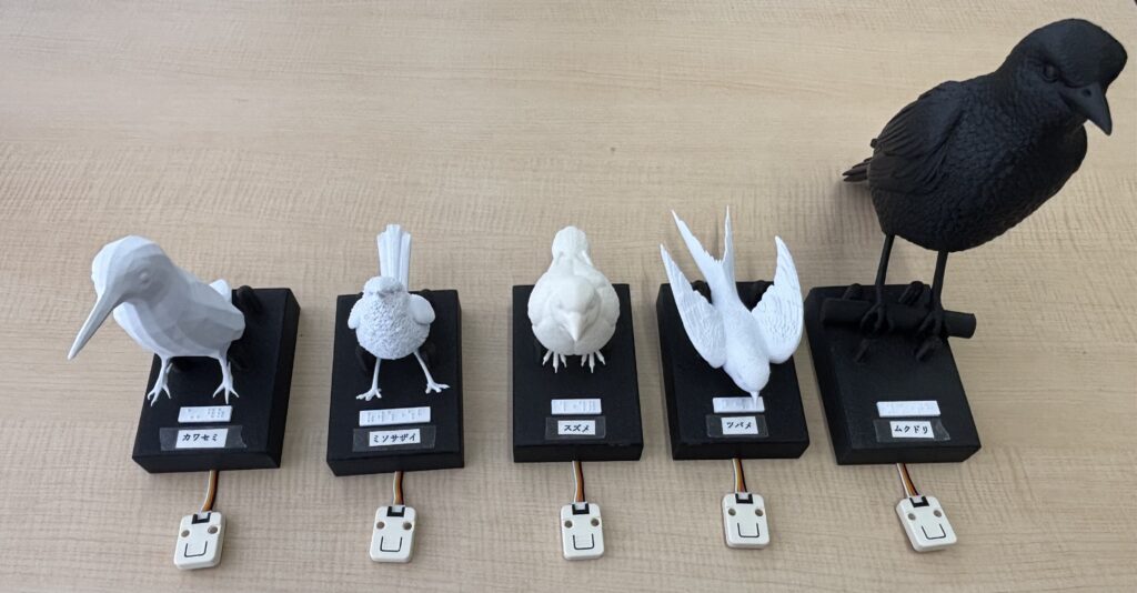 慶應義塾大学総合政策学部4年の山田拓海さんの研究で、視覚情報に頼らずに鳥の形や飛翔動作を理解できる新しい多感覚教材を開発しておられ、鳴き声図鑑に掲載されている音源が利用されることになりました。この研究は、視覚障害者の方々を「バードリスニング(聴覚による鳥類調査)」の調査員として活躍できる仕組みの構築を目指しておられるそうです。現在は、剥製や標本データをもとに鳥の姿を3Dモデル化し、3Dプリンタで出力した触察模型と鳴き声の再生機構を組み合わせたものを制作しているとのことです。任意の日本語の文字列を入力すると、その文字を点字として3Dプリンタで出力できるプログラムも独自に開発されたそうです。