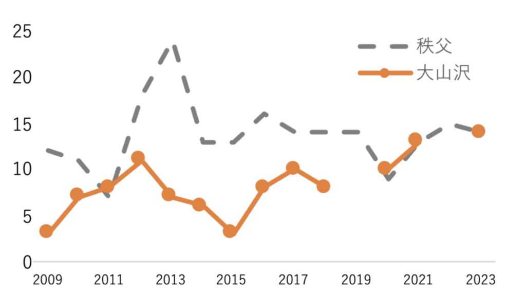 大山沢サイトは、現在は林道の崩落が激しくなって調査できていないのですが、次の繁殖期は調査体制を整えて調査できればと検討しています。
