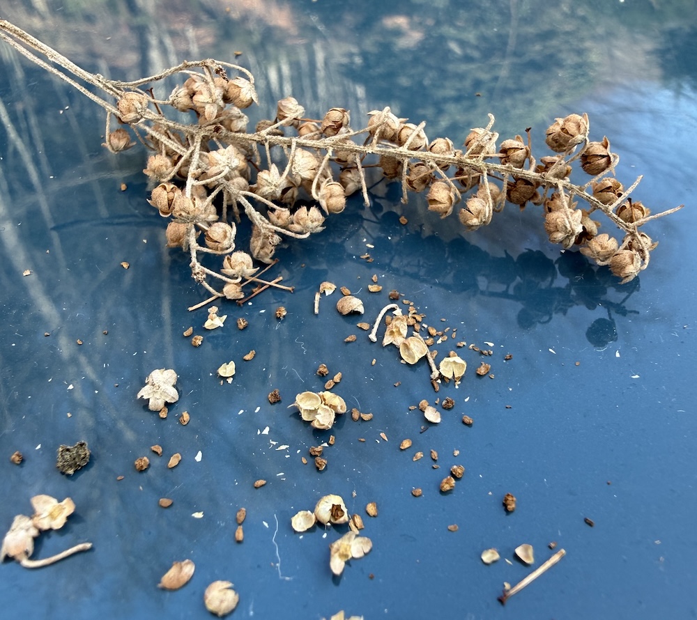 中にはごく小さい種子が入っていて、ほぐすとパラパラとそれが出てきました(写真の茶色い粒)。おそらくこの種子を食べているのでしょう。器用なものですね。こうした観察記録もちまちまとためていこうと思います。