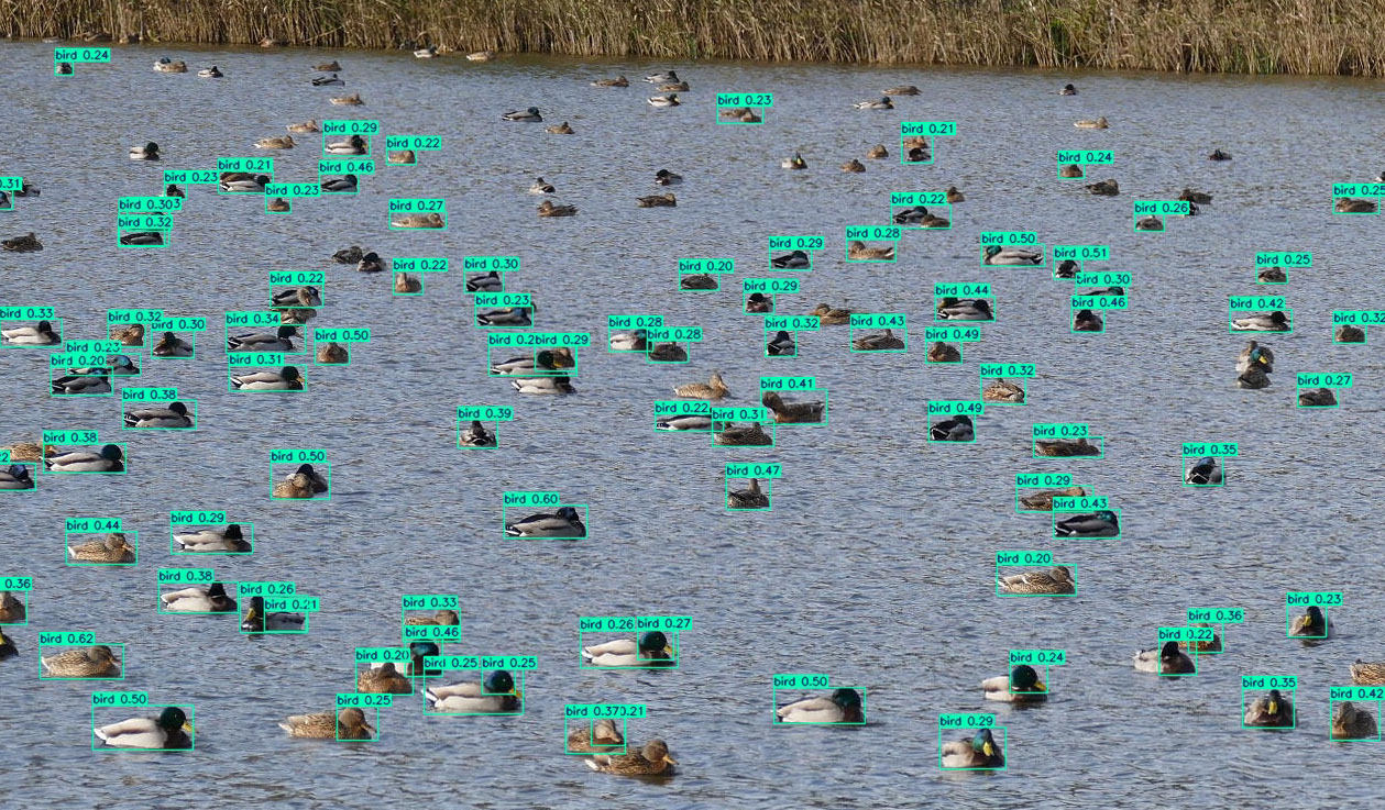 2枚目は、もう少しカモが多い溜池の写真です。この写真もクリックで拡大します。この溜池には写真に見える範囲の5倍以上のカモがいたので、このくらいになるとAIカウントが便利です。ヨシ原の手前あたりは遠いので小さく、ピンボケ気味のためAIがカモを認識できませんでしたが、それも独自モデルを作れば認識するようになると思います。